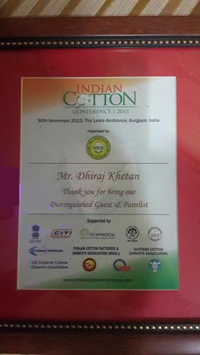 Feliciation of Mr. Dhiraj Khetan, Director SASMPL on INDIAN COTTON CONFERENCE 2013